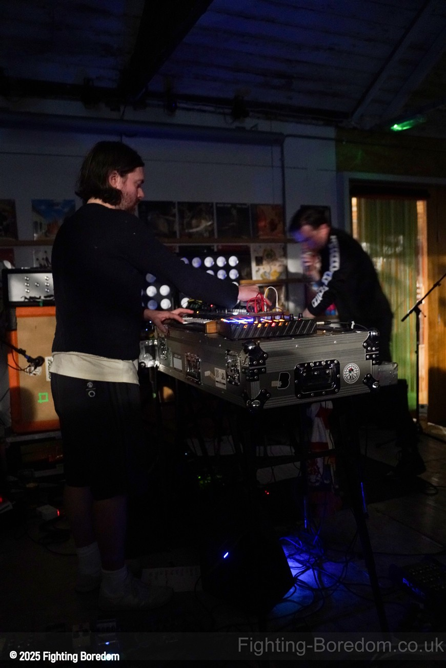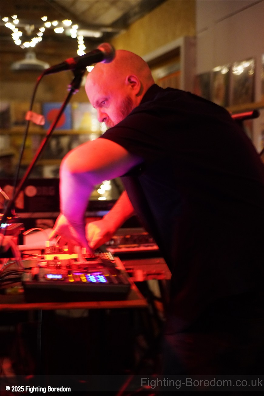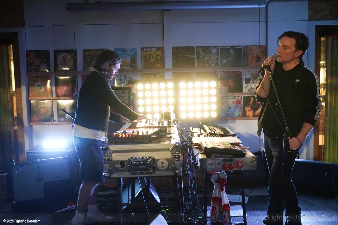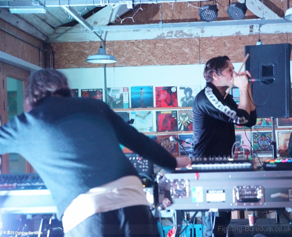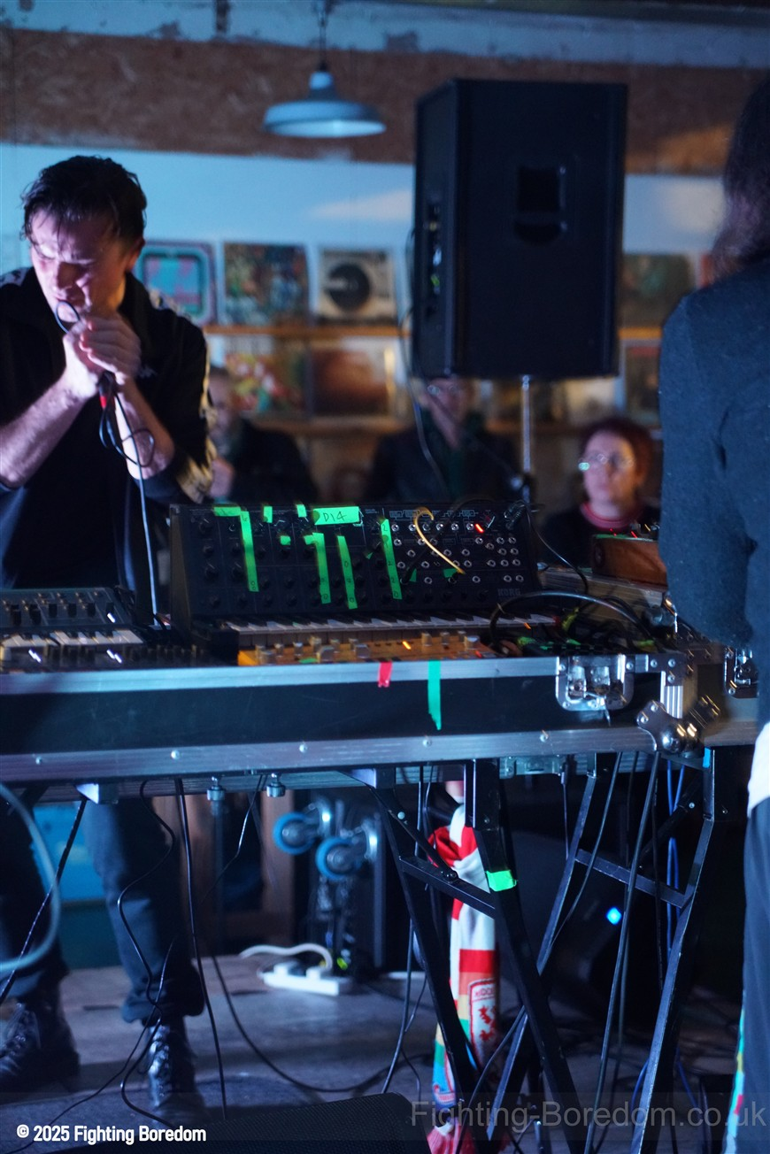 We stand by Benefits as they write out setlists and then they are up fiddling with the electronics, the singer says Good Evening Coventry, and goes on to say what a special place the record shop is, and how it’s going to be pretty overwhelming tonight so if it gets too much you can leave without them feeling bad. He stops and ‘I’m looking up in awe at a mountain of shit’ A slow strobe and low synths wash in. It’s immediately angry, deeply political and you really have to care to feel like this. The synths rise into a solid wall of sound, smashing in waves across the room, static rises and stones quickening to make the whole thing disorientating and harsh, he’s shouting now, Reject Hate! We Care! It’s a massive noise. Tinny beats, shouting and despair he is holding a drumstick to gesture and accentuate his words as the other guy stands solidly behind the band of electronics creating a noise like a broken aeroplane engine, it slows and crackles, guitar sound whines in and feedback squeals as low synths start to move to the front again. Spoken word and the anger is rising as he explains that we are not all the same, Hail to the Thief! And there are synths, beats, noise and full on strobe madness, it’s an all out assault. A fast rudimental beat and ‘stop telling me to tighten my belt’ It’s pure anger, squealing synths and broken drumming, livid. THIS IS WAR! Stop telling us what to do, we are not in it together and never have been.