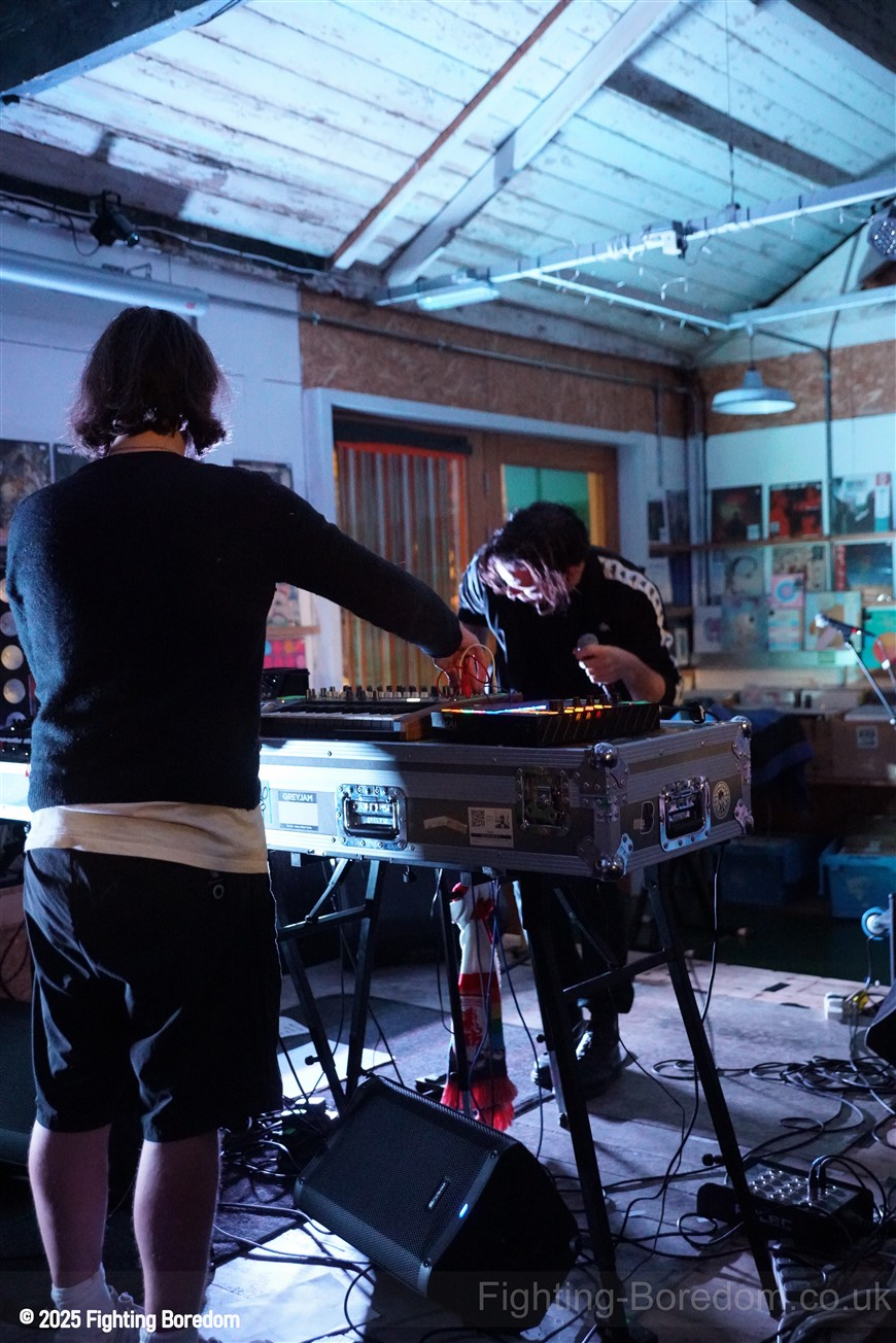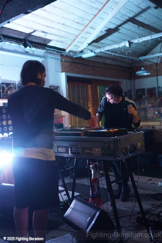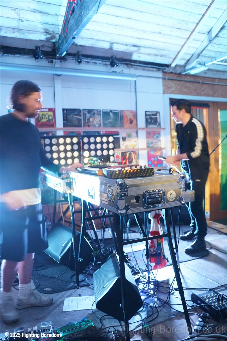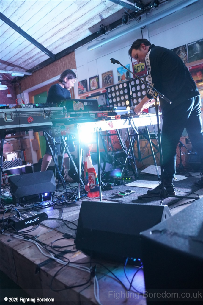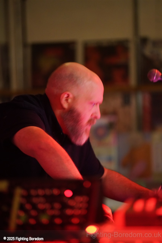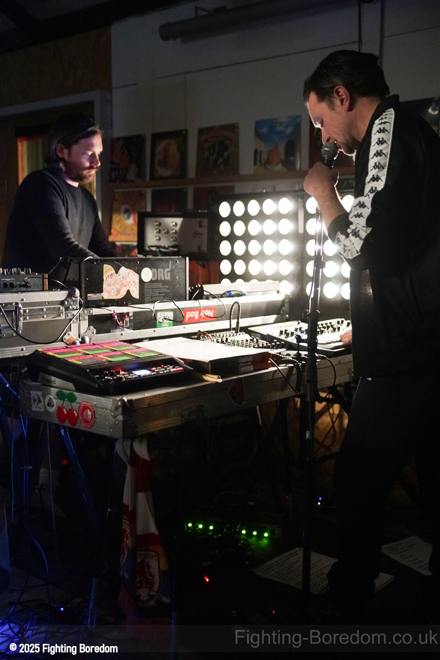 We stand by Benefits as they write out setlists and then they are up fiddling with the electronics, the singer says Good Evening Coventry, and goes on to say what a special place the record shop is, and how it’s going to be pretty overwhelming tonight so if it gets too much you can leave without them feeling bad. He stops and ‘I’m looking up in awe at a mountain of shit’ A slow strobe and low synths wash in. It’s immediately angry, deeply political and you really have to care to feel like this. The synths rise into a solid wall of sound, smashing in waves across the room, static rises and stones quickening to make the whole thing disorientating and harsh, he’s shouting now, Reject Hate! We Care! It’s a massive noise. Tinny beats, shouting and despair he is holding a drumstick to gesture and accentuate his words as the other guy stands solidly behind the band of electronics creating a noise like a broken aeroplane engine, it slows and crackles, guitar sound whines in and feedback squeals as low synths start to move to the front again. Spoken word and the anger is rising as he explains that we are not all the same, Hail to the Thief! And there are synths, beats, noise and full on strobe madness, it’s an all out assault. A fast rudimental beat and ‘stop telling me to tighten my belt’ It’s pure anger, squealing synths and broken drumming, livid. THIS IS WAR! Stop telling us what to do, we are not in it together and never have been.