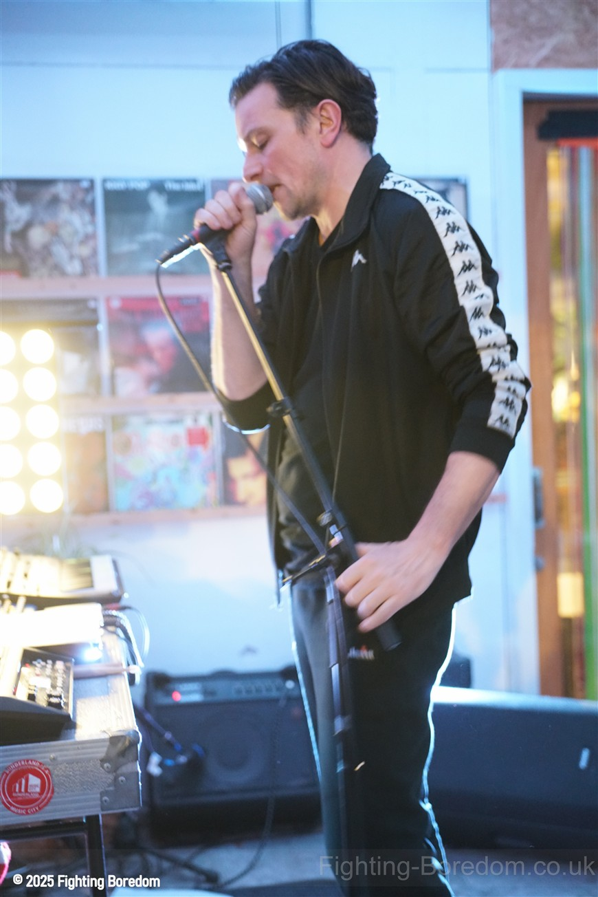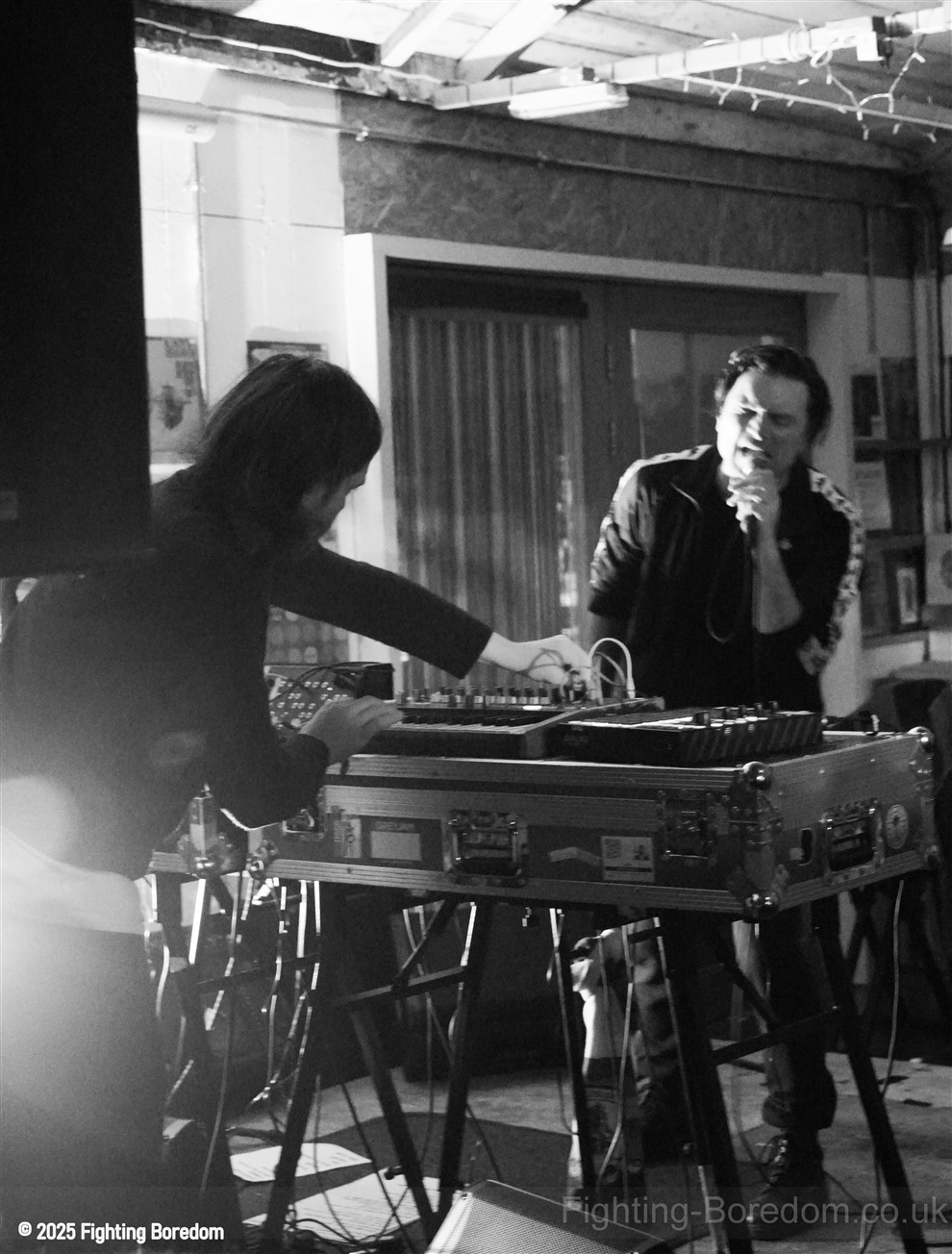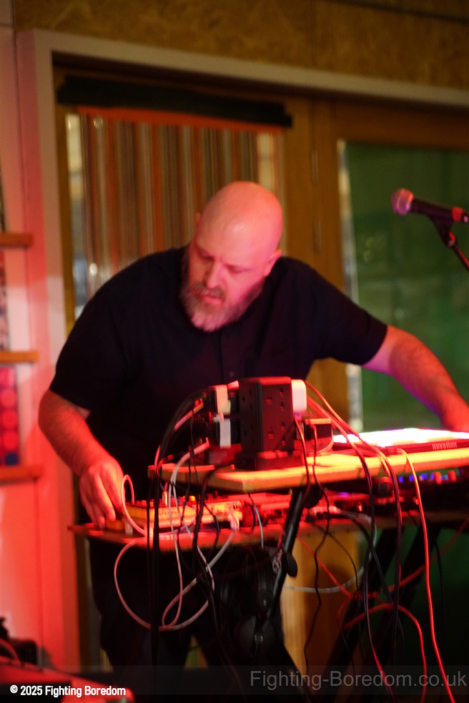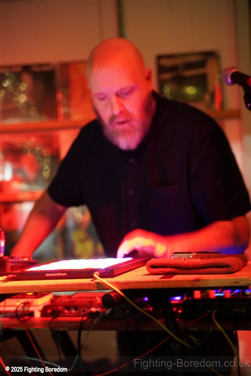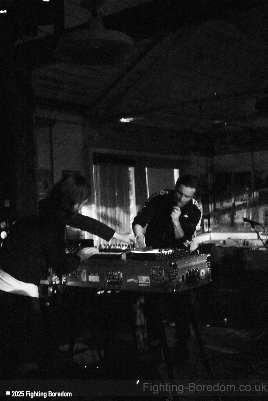 We stand by Benefits as they write out setlists and then they are up fiddling with the electronics, the singer says Good Evening Coventry, and goes on to say what a special place the record shop is, and how it’s going to be pretty overwhelming tonight so if it gets too much you can leave without them feeling bad. He stops and ‘I’m looking up in awe at a mountain of shit’ A slow strobe and low synths wash in. It’s immediately angry, deeply political and you really have to care to feel like this. The synths rise into a solid wall of sound, smashing in waves across the room, static rises and stones quickening to make the whole thing disorientating and harsh, he’s shouting now, Reject Hate! We Care! It’s a massive noise. Tinny beats, shouting and despair he is holding a drumstick to gesture and accentuate his words as the other guy stands solidly behind the band of electronics creating a noise like a broken aeroplane engine, it slows and crackles, guitar sound whines in and feedback squeals as low synths start to move to the front again. Spoken word and the anger is rising as he explains that we are not all the same, Hail to the Thief! And there are synths, beats, noise and full on strobe madness, it’s an all out assault. A fast rudimental beat and ‘stop telling me to tighten my belt’ It’s pure anger, squealing synths and broken drumming, livid. THIS IS WAR! Stop telling us what to do, we are not in it together and never have been.