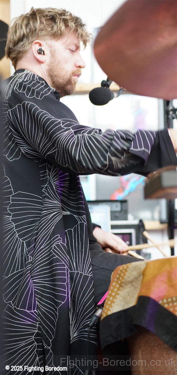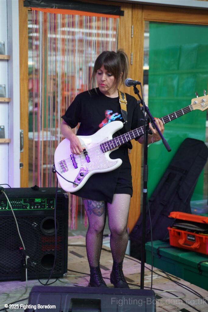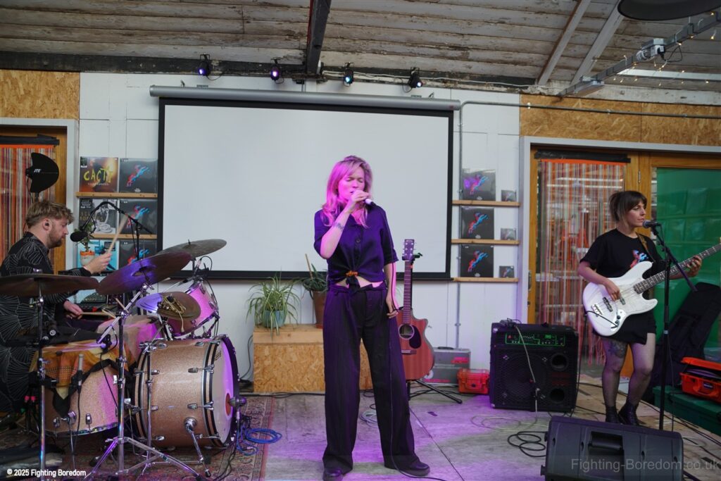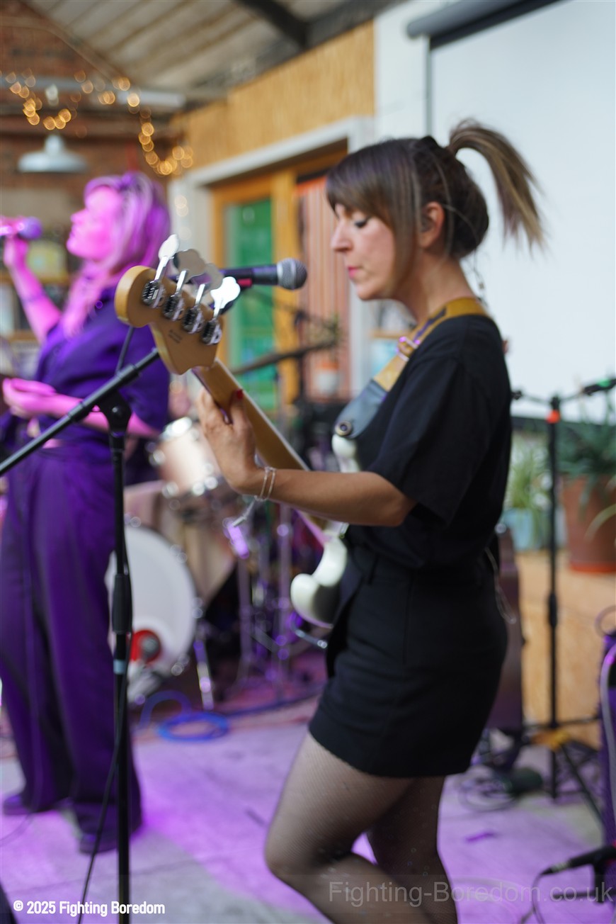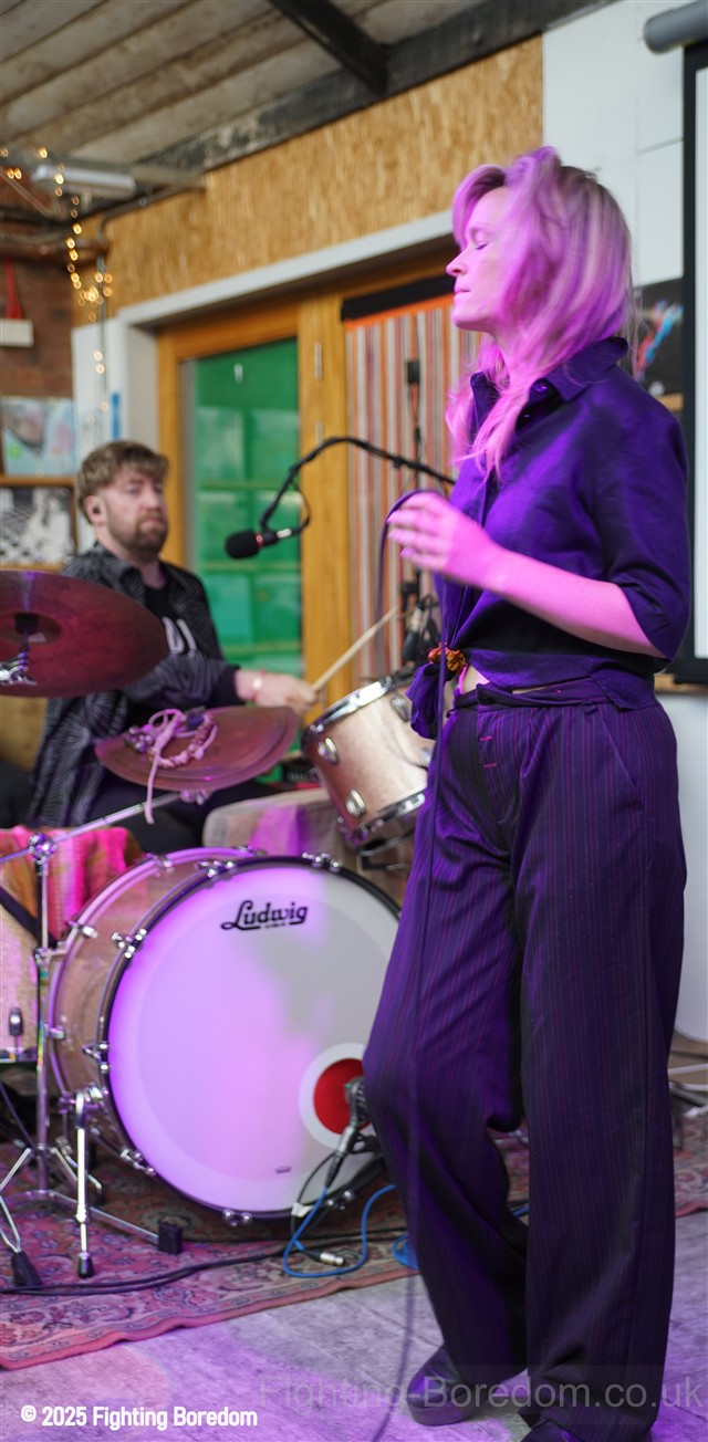 It is full in here, I aim for the side where me and the daughter stand and wait, the Photographer weaves his way into the very mixed up varied crowd and the band head onto the stage, They smile and Billy thanks us for coming out and introduces the band to start the set. Then ‘This is Metal Horse’. They start playing idiosyncratic pop music with a funky poppy vibe, the drums have cloth clamped onto them to muffle them I presume. It is on the odd side of good, her vocal is distinctive and strong and although she has a pink light on her throughout the show, the cloudy sunlight coming through the skylight makes the room feel warm. Inclusive and brightly lit.