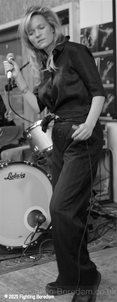 The band are now grinning widely between songs. She explains that Hugh Cornwell is on the next song on the album, not here obviously! She says that it’s odd when your heroes appear and offer to sing with you. The song is low and bass led, perfect for Hugh I would have thought, It’s echoing and deep with a Bunnymen and Joy Division feel, it’s a great song with another excellent vocal, this time it almost feels angry. The next one has a low sensual vocal and music to match, think classic eighties pop.