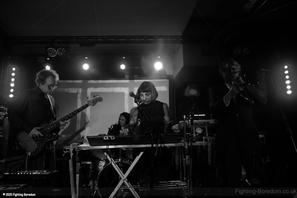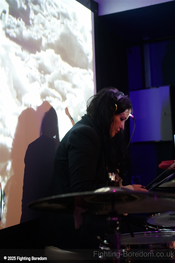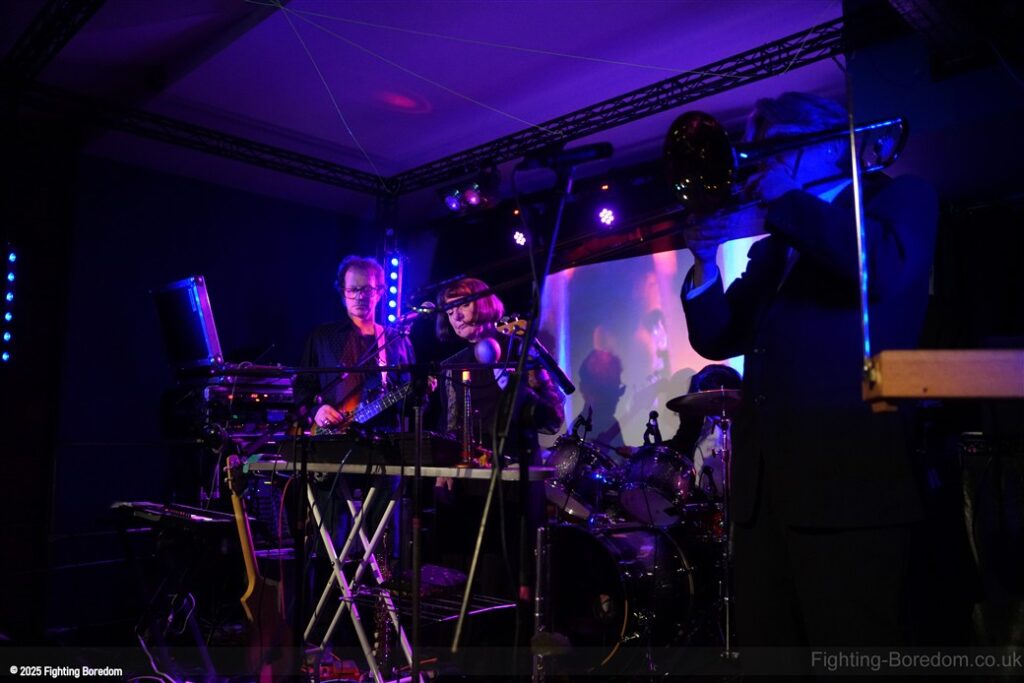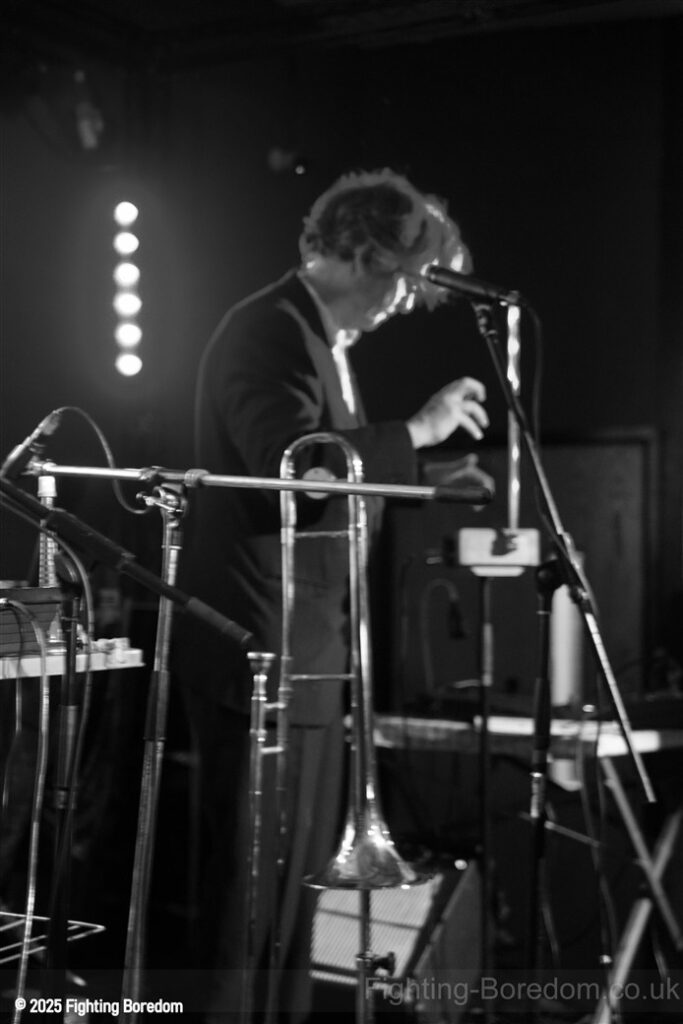 One of PRAM is now playing a theremin, weirdly psychedelic grooves emanate from the stage, the vibrations have turned heavy and slow. The drummer plays slow but strill gives the impression of filling every gap. All the sounds are swamped by the enormous bass line and jazzy skittering drums, it’s weird and electronic underneath and that’s when the glorious rasp of the trombone comes in again. The Theremin wobbles on at the edge underneath it all too. This broken and fractured lounge music.