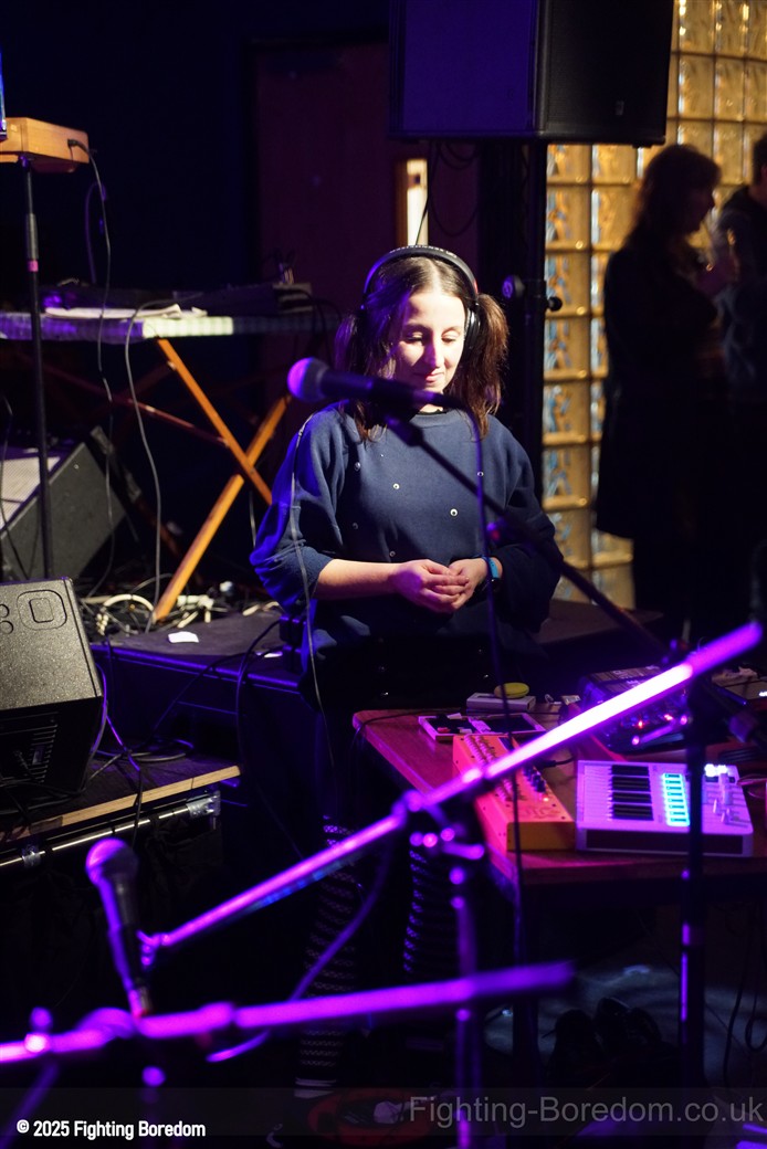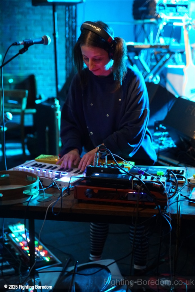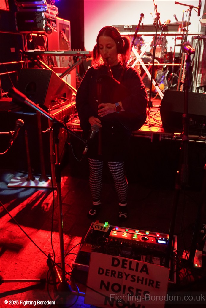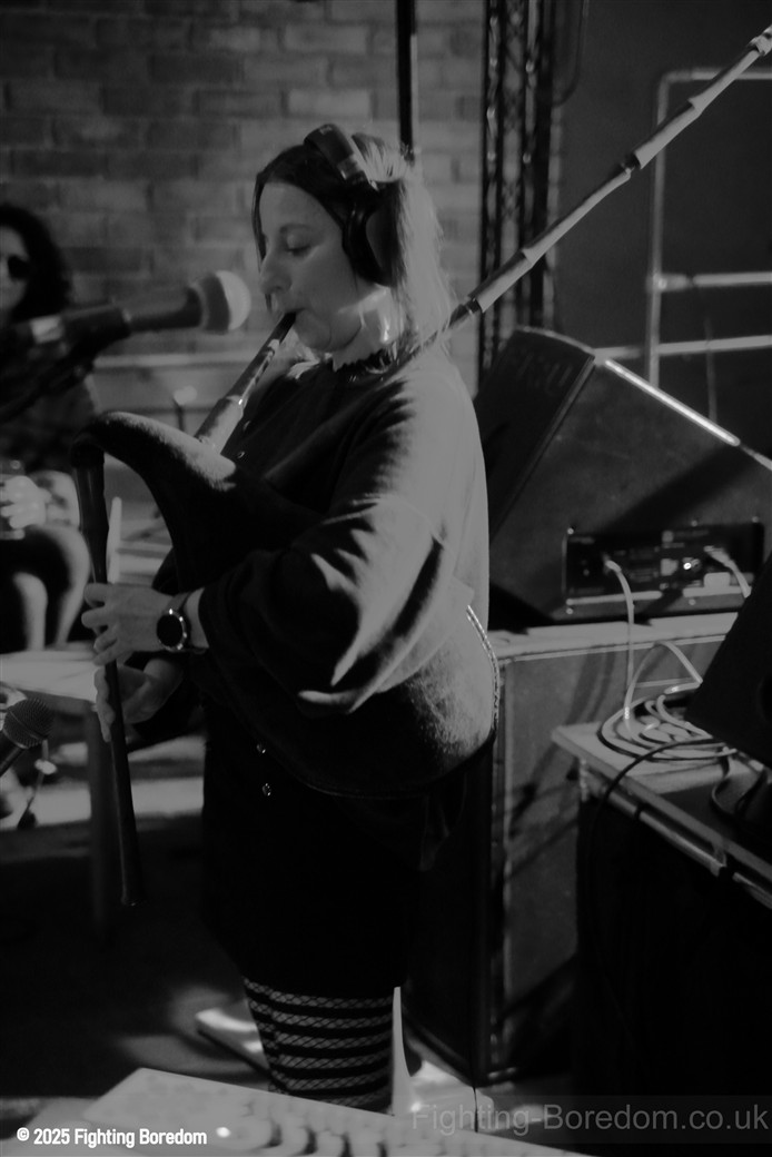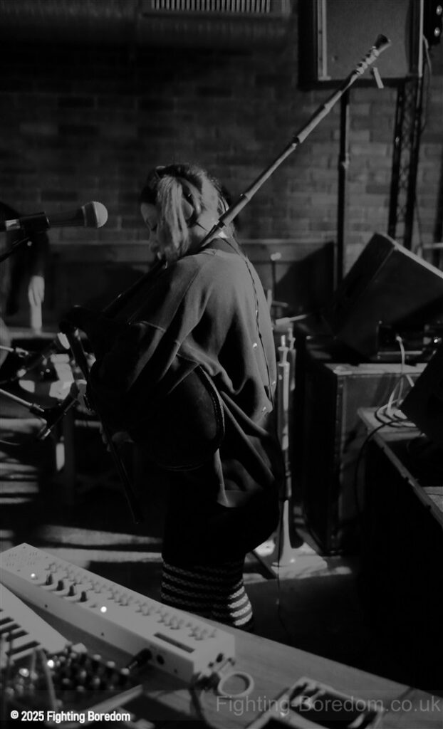 Madrigirl starts with English Border Pipes, I know what they are because she tells us. The drone they make is haunting and rich, she echoes and layers the pipe sounds on top of each other using the equipment in front of her to make it move around and twist inside itself. It’s a haunting, lost and lonely sound. She manipulates the electronics and the pipes carry on layering as bass notes emerge, the music takes on a lower, darker folk feel. You become conscious of the noise falling away and she starts to play the pipes again. They Swirl and move around the room. A rumbling drone comes into play and it’s punctuated with odd notes. She talks about the music she creates being ‘Ancient and modern together’ which describes the set perfectly.