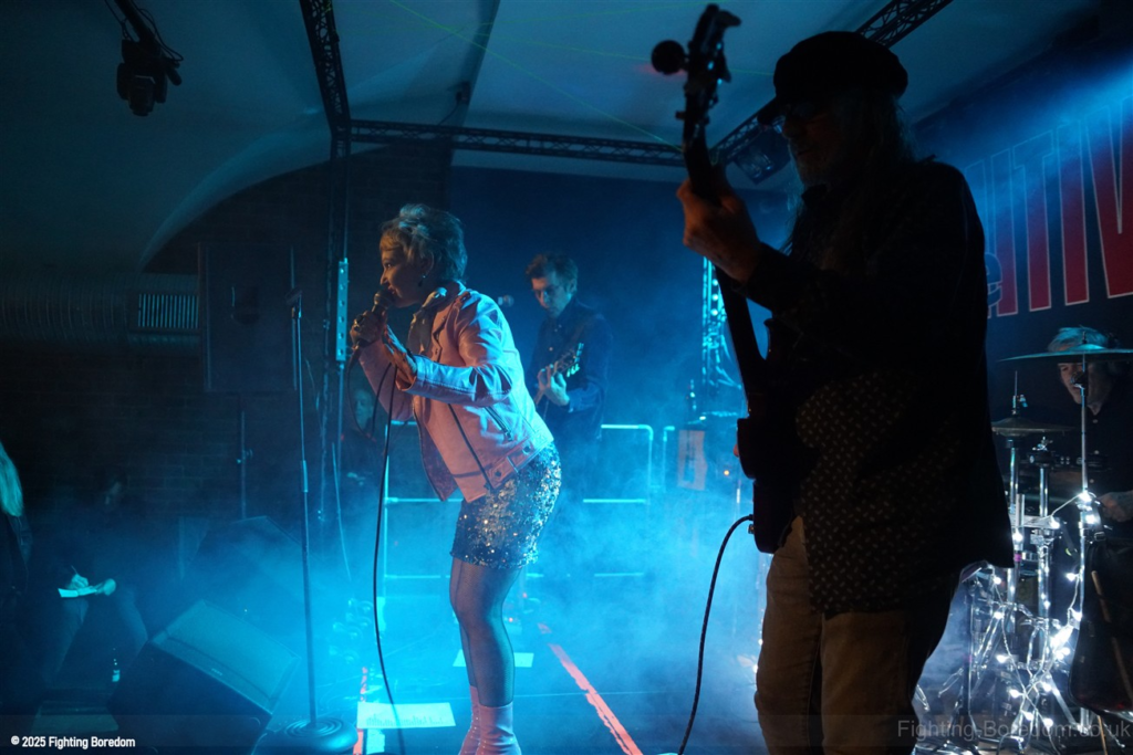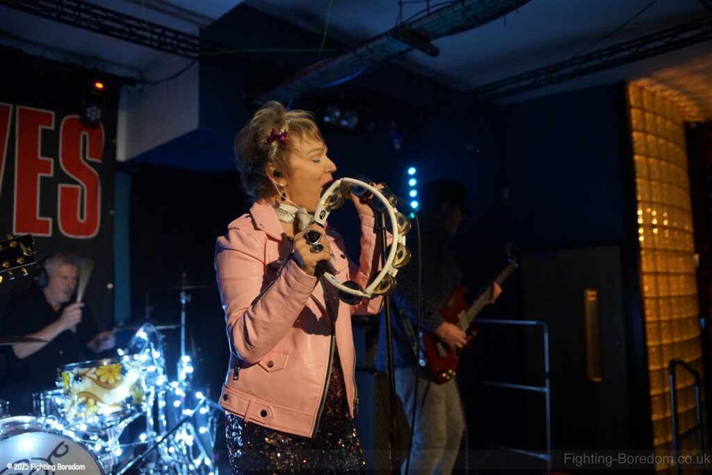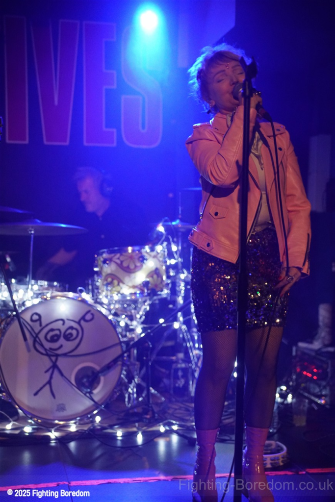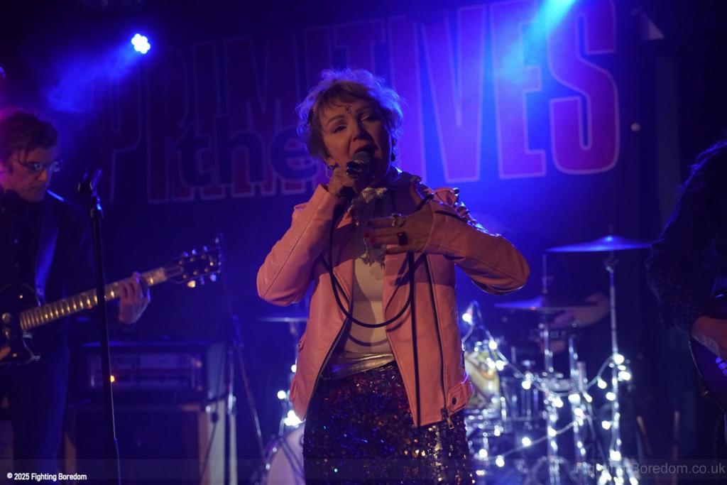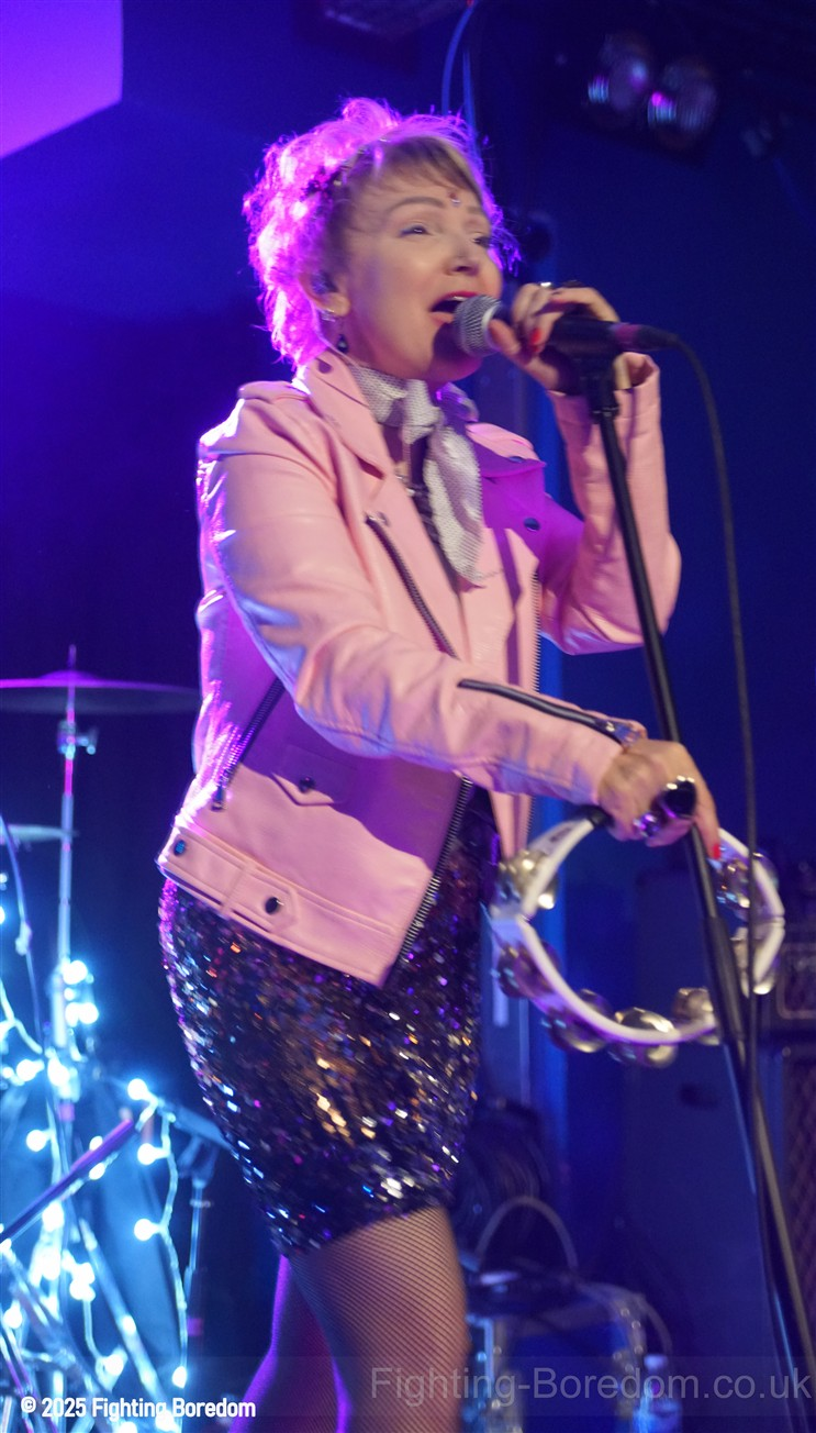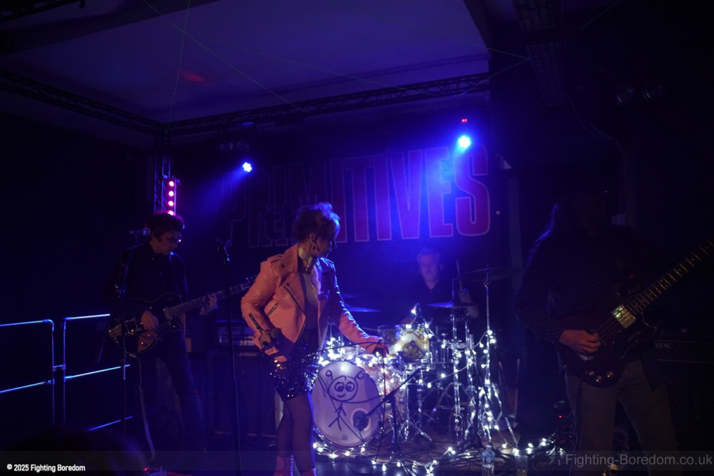The room fills up as people stand and chat to friends, it’s a warm almost family feel in here as Coventry welcomes The Primitives home. They are all onstage, the three guys in black and Tracey resplendent in a sequin dress, pink boots and pink leather biker jacket. She moves around the stage, dancing, swaying and obviously enjoying herself immensely. The Cords are right in the middle at the front watching too. The band are hard, loose and fast, exactly right. They go straight into Stop Killing Me, fast, furious drums and thrashing guitars, fast bass underneath and the bubblegum indie pop vocal that makes them special. Tracey is all over the stage shaking her tambourine, gesturing and singing. They carry on with a more poppy sound, it’s loud and fast but the edge is the vocal. Tracey bemoans how it can be a fortieth anniversary tour when she’s only thirty five? Then Buzz Buzz Buzz with its rockabilly groove and urgency.