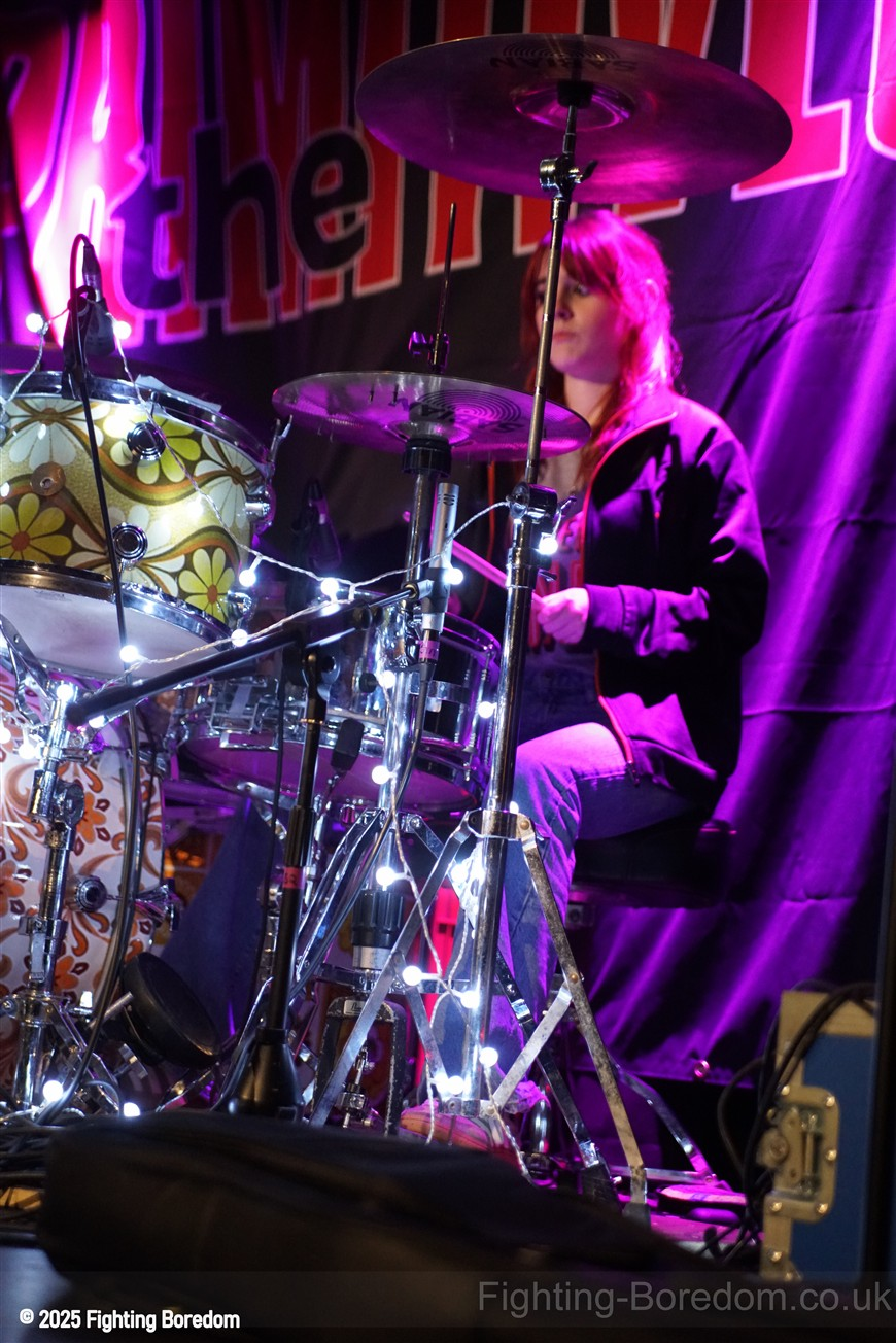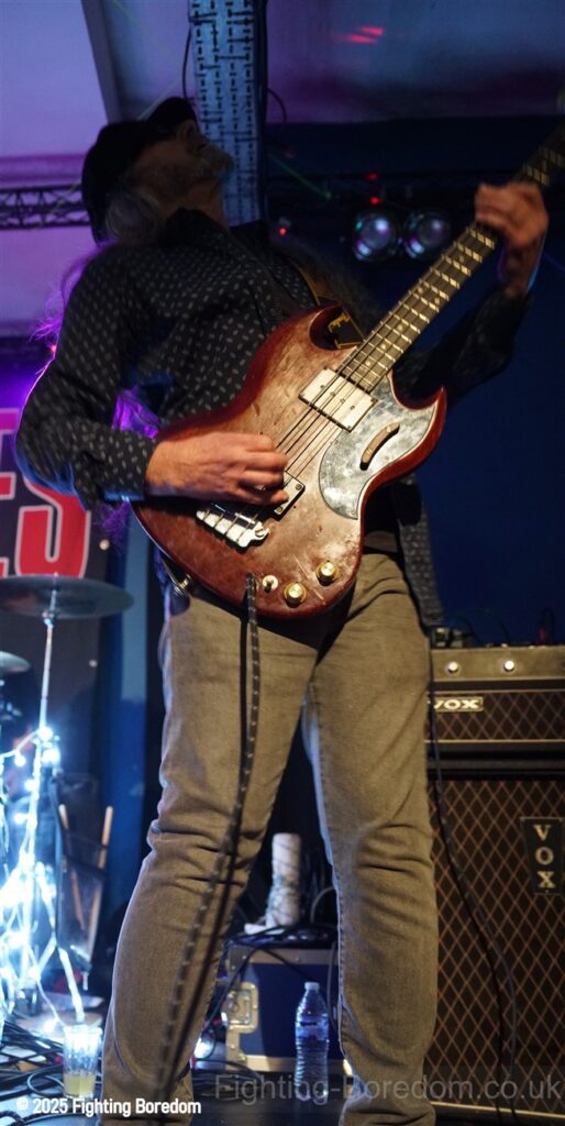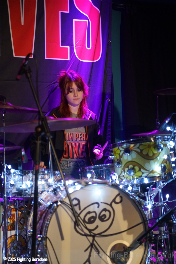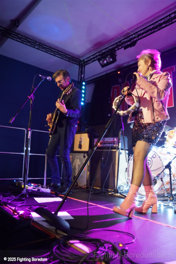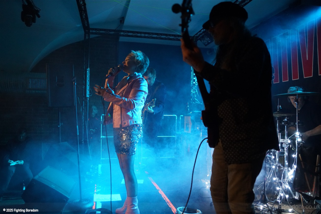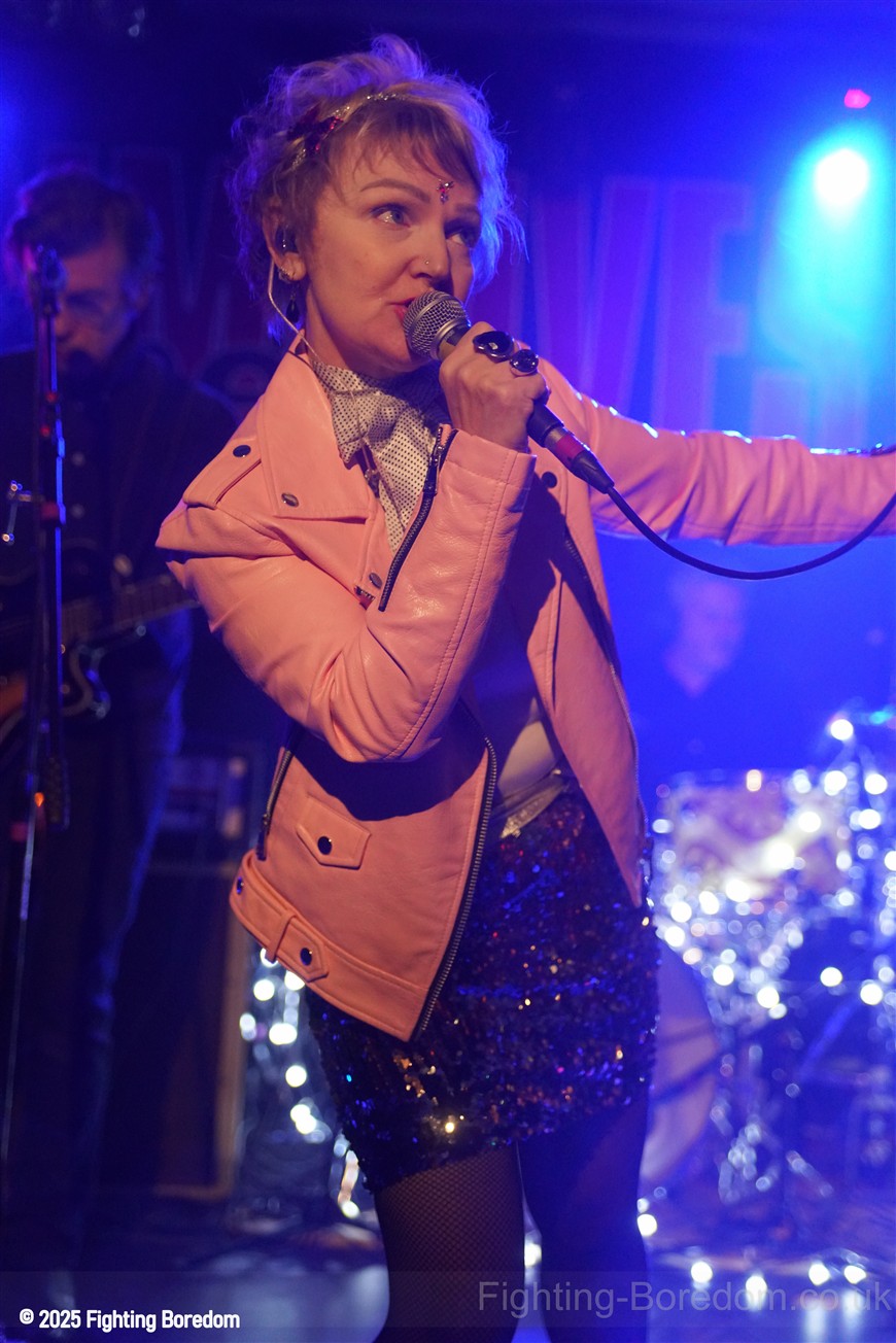 The room fills up as people stand and chat to friends, it’s a warm almost family feel in here as Coventry welcomes The Primitives home. They are all onstage, the three guys in black and Tracey resplendent in a sequin dress, pink boots and pink leather biker jacket. She moves around the stage, dancing, swaying and obviously enjoying herself immensely. The Cords are right in the middle at the front watching too. The band are hard, loose and fast, exactly right. They go straight into Stop Killing Me, fast, furious drums and thrashing guitars, fast bass underneath and the bubblegum indie pop vocal that makes them special. Tracey is all over the stage shaking her tambourine, gesturing and singing. They carry on with a more poppy sound, it’s loud and fast but the edge is the vocal. Tracey bemoans how it can be a fortieth anniversary tour when she’s only thirty five? Then Buzz Buzz Buzz with its rockabilly groove and urgency.
