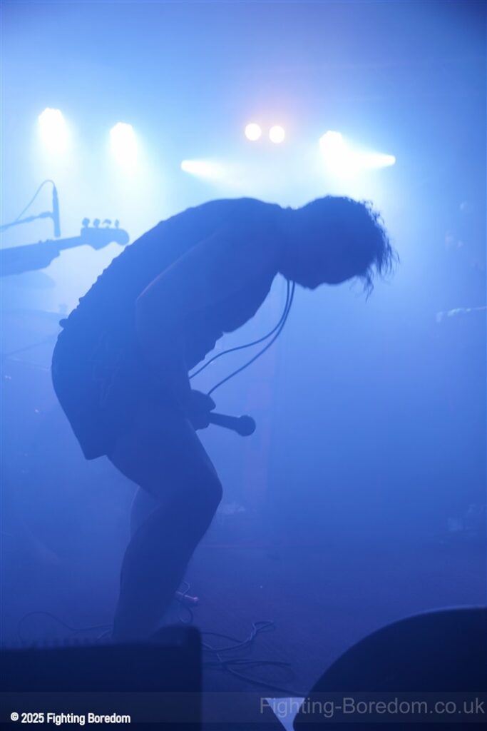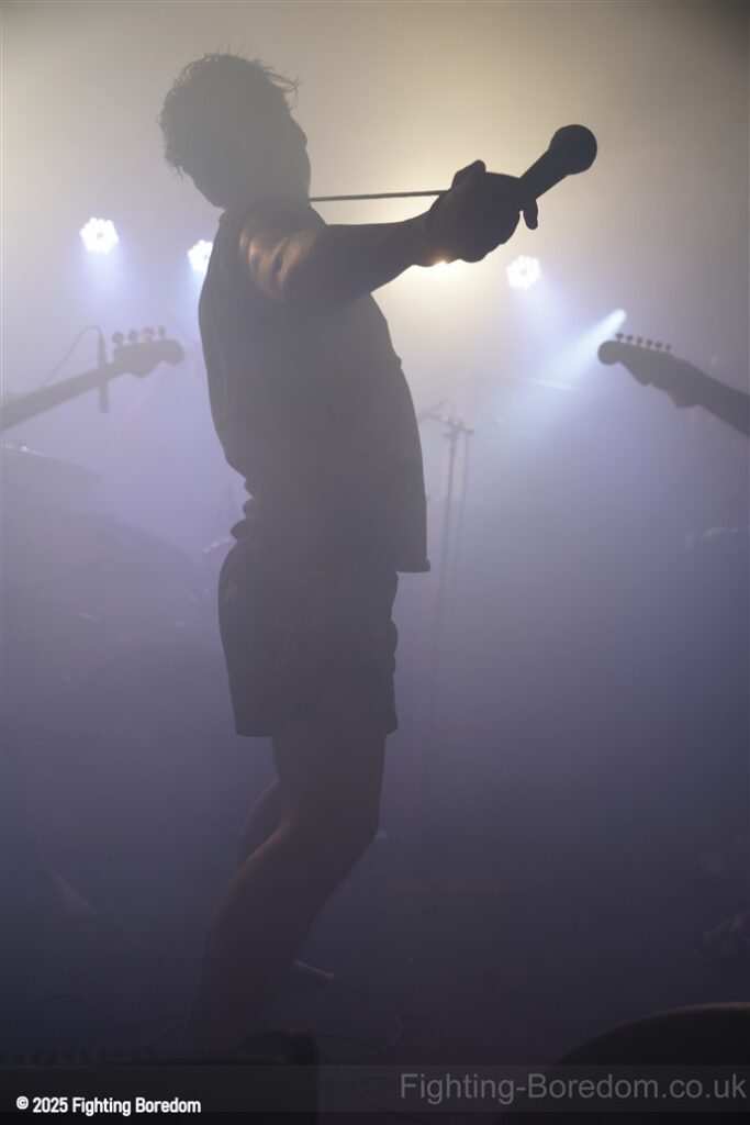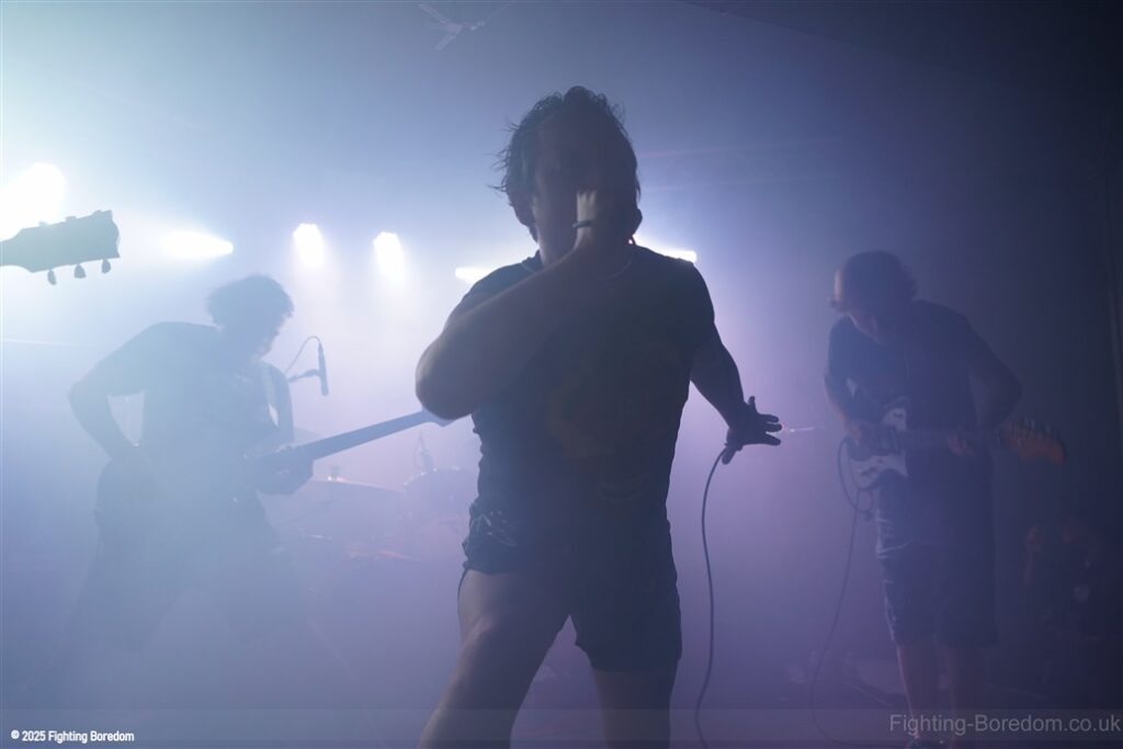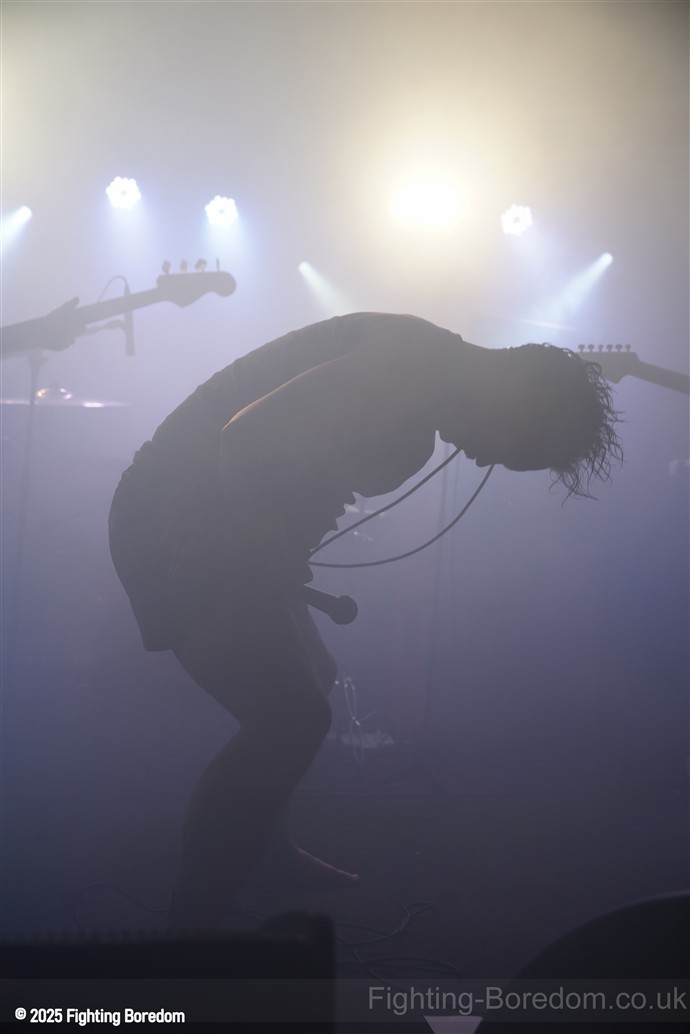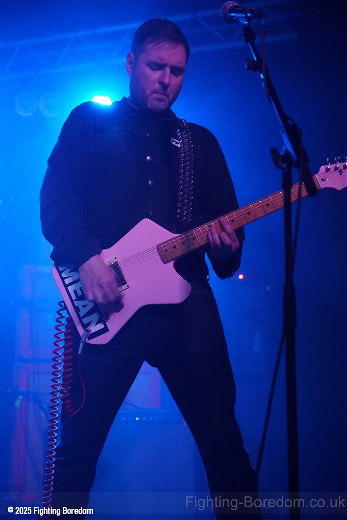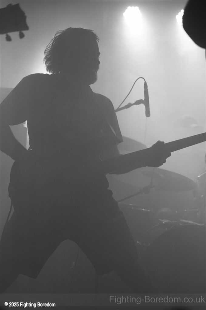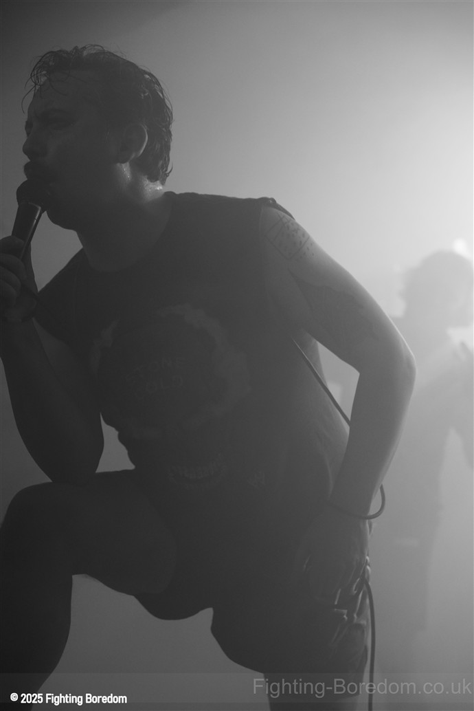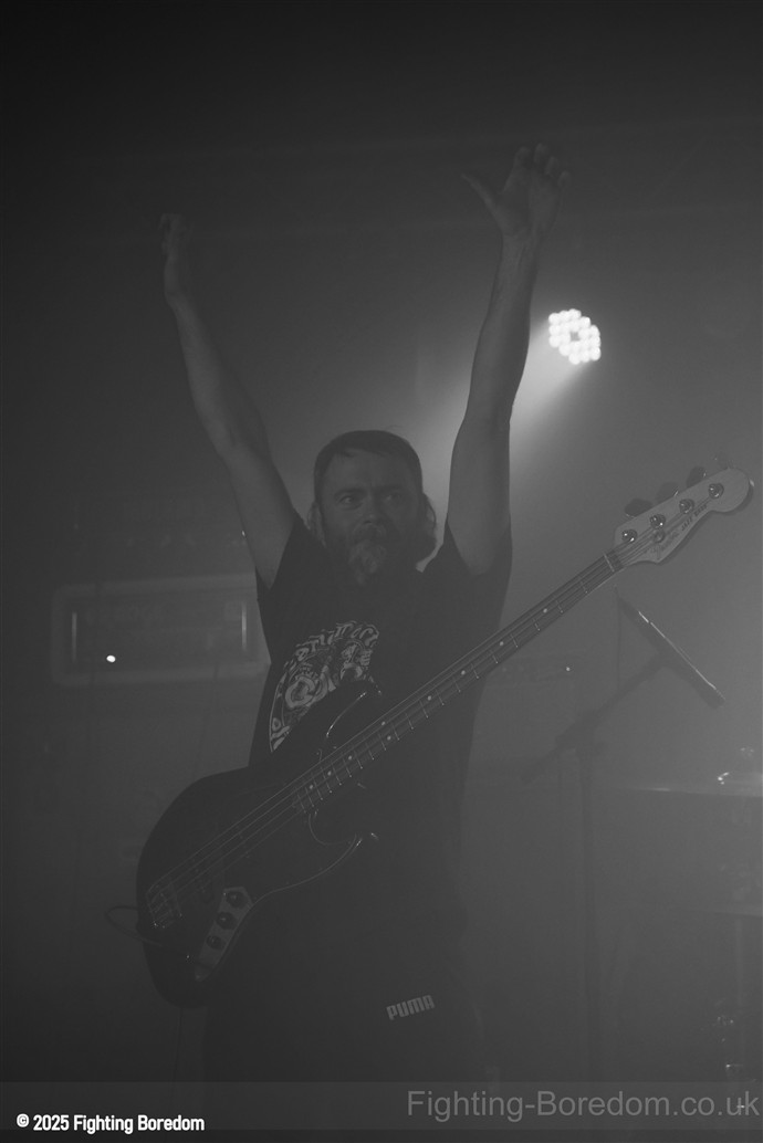 The back of the room is jammed. The stage fills with dry ice and the lights roam. The lights go down and AC/DC’s For Those About To Rock plays, fellow Geordie Brian Johnson spitting out the words. For the record, it was the first album I ever bought, a statement of intent from the Pigs. It finishes and they slip onstage in the dark. There’s a whine of feedback and a huge riff, bass, drums and strobes slam in too and they are rising up over and over, one massive groove. Everything all at once, it stops, huge drums sound and Matt is onstage in demon t shirt and thai boxing shorts, he leans in and starts to sing and it’s at that moment that it usually makes perfect sense but it doesn’t. The sound is full of mud, nothing is coming together and all can hear is his vocals and a massive buzz of bass feedback. This is sorted sharpish however and they start to shine through.