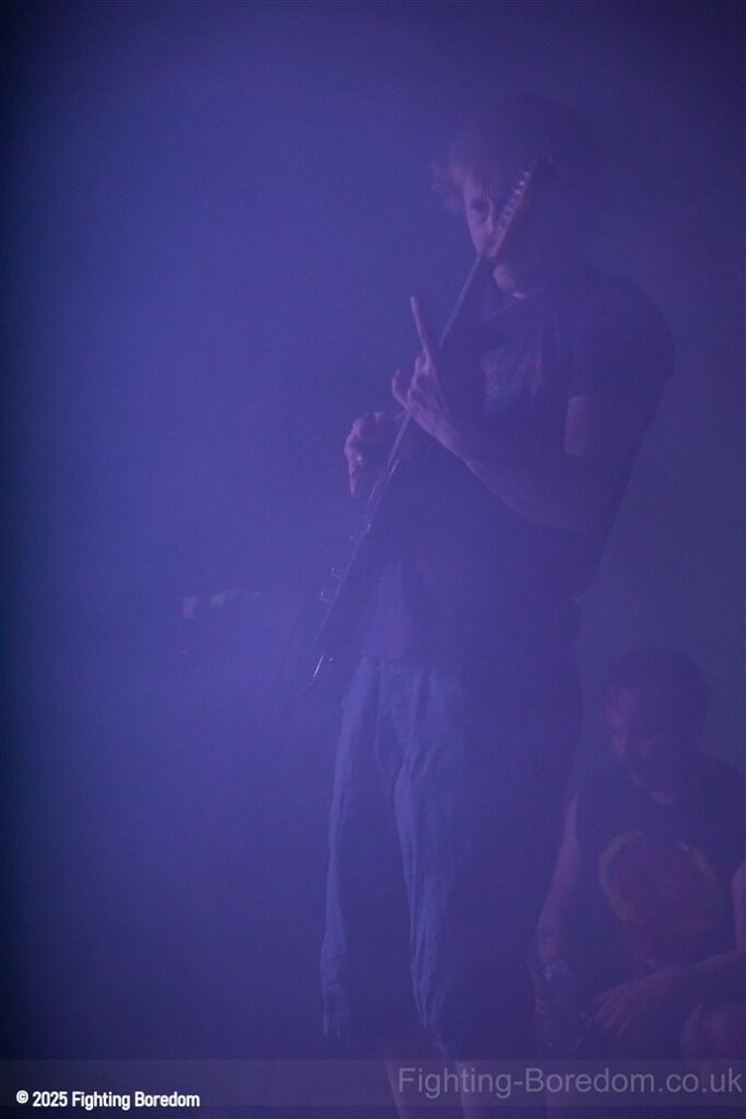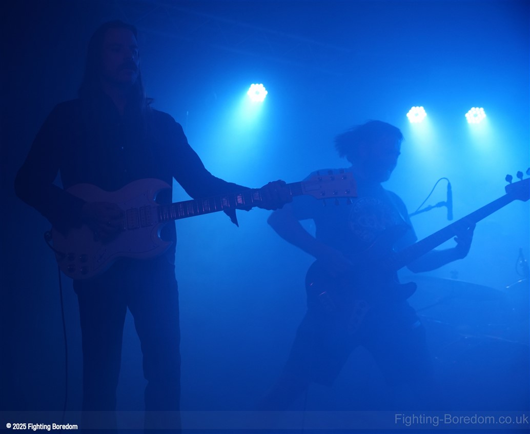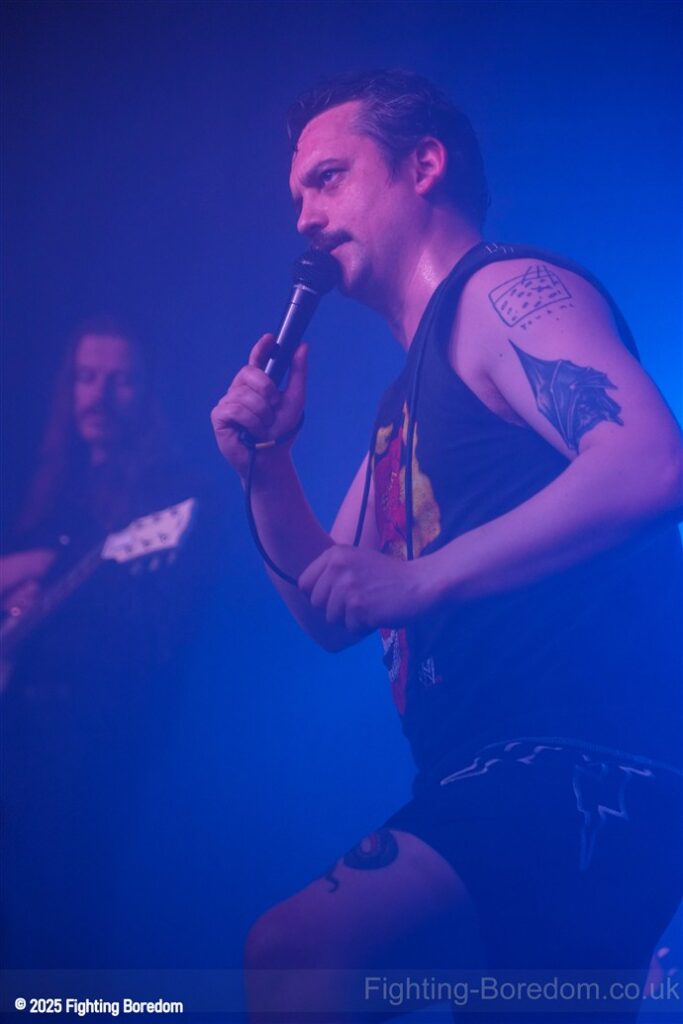 They start off a groove, a massive riff based groove and just carry it on, the one guitarist holding his guitar by his head and moving around, the other, looking like a true Metal God stands stock still. Cool as. The bassist and drummer keep it loose and swinging, it’s a very metal boogie and people are moving to it across the room. The vocals now sound ace as he holds the mic out like a sacrifice and moves like a man possessed.